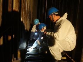 3、對爐膛及尾部受熱面積灰使用沖洗水或壓縮空氣清理,掛焦人工清理,使管子表面無積灰,無掛焦。檢查人員以兩人為一組,備好工具袋、測厚儀、卡尺、內窺鏡、無損檢驗設備、手電筒等工具;盡可能避免上下交叉檢查作業,如無法錯開,必須設置可靠的隔離措施。高處檢查作業,進入汽包、煙道、爐膛等內部檢查時,應有專人監護,并有合理的安全通道。